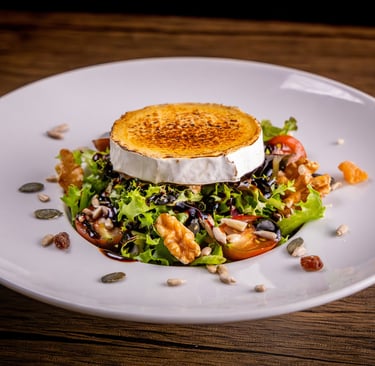 Mezcla de lechugas, tomates cherry, queso de cabra, frutos secos y aliño de vinagre Pedro Ximénez. Fresca, sabrosa y con un toque dulce.