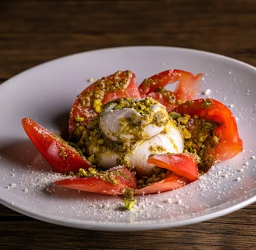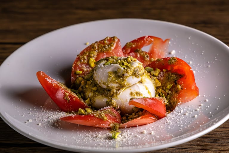 Tomate de temporada, burrata cremosa, pesto casero, pistachos y parmesano. Italia servida en plato.