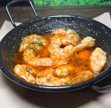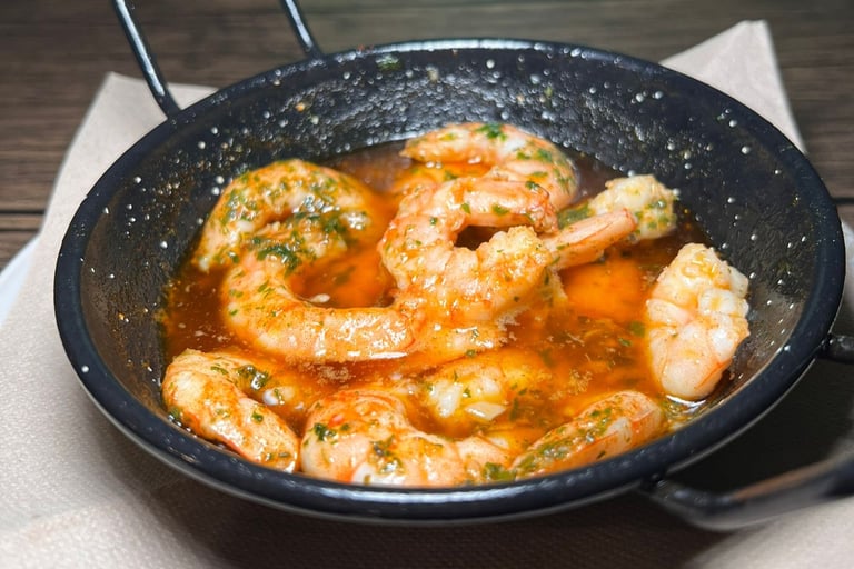 Langostinos salteados en AOVE con ajo, perejil, guindilla y vino blanco. Jugosos y con el punto justo de picante.