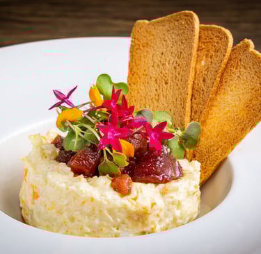Versión malagueña del clásico tartar, con salchichón de “Garcia Agua” y un aliño suave con un puntito de picante. Una tapa con identidad.