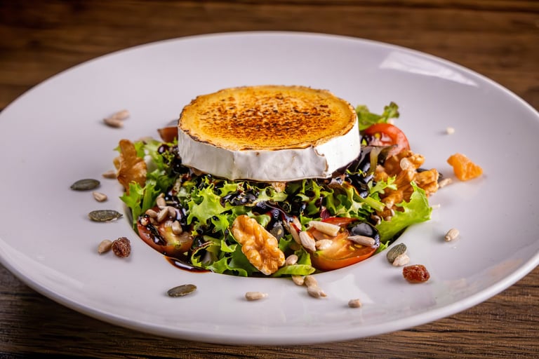 Filete de ternera empanado, crujiente por fuera y jugoso por dentro, relleno de queso de cabra cremoso, jamón ibérico y pimiento rojo caramelizado. Un clásico reinventado.