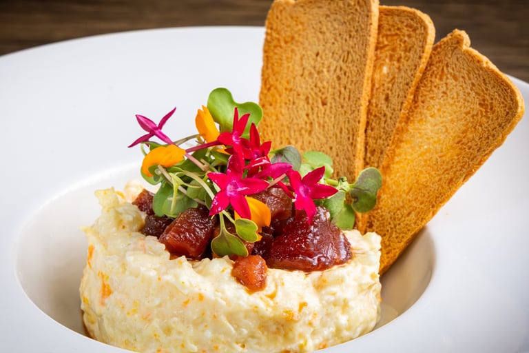 Una reinterpretación del sabor malagueño más auténtico. Pasta filo rellena de merluza y langostino, servida al estilo “puro habano” sobre polvo de alga nori y una mayonesa inspirada en el clásico gazpachuelo. Tradición, mar y creatividad en un solo bocado.